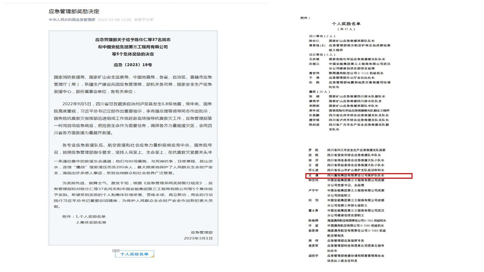 近日,应急管理部[2023]19号文件下发,对泸定抗震救灾表现突出的个人和集体进行奖励,星空(中国)矿山救护队队长王谦榜上有名。