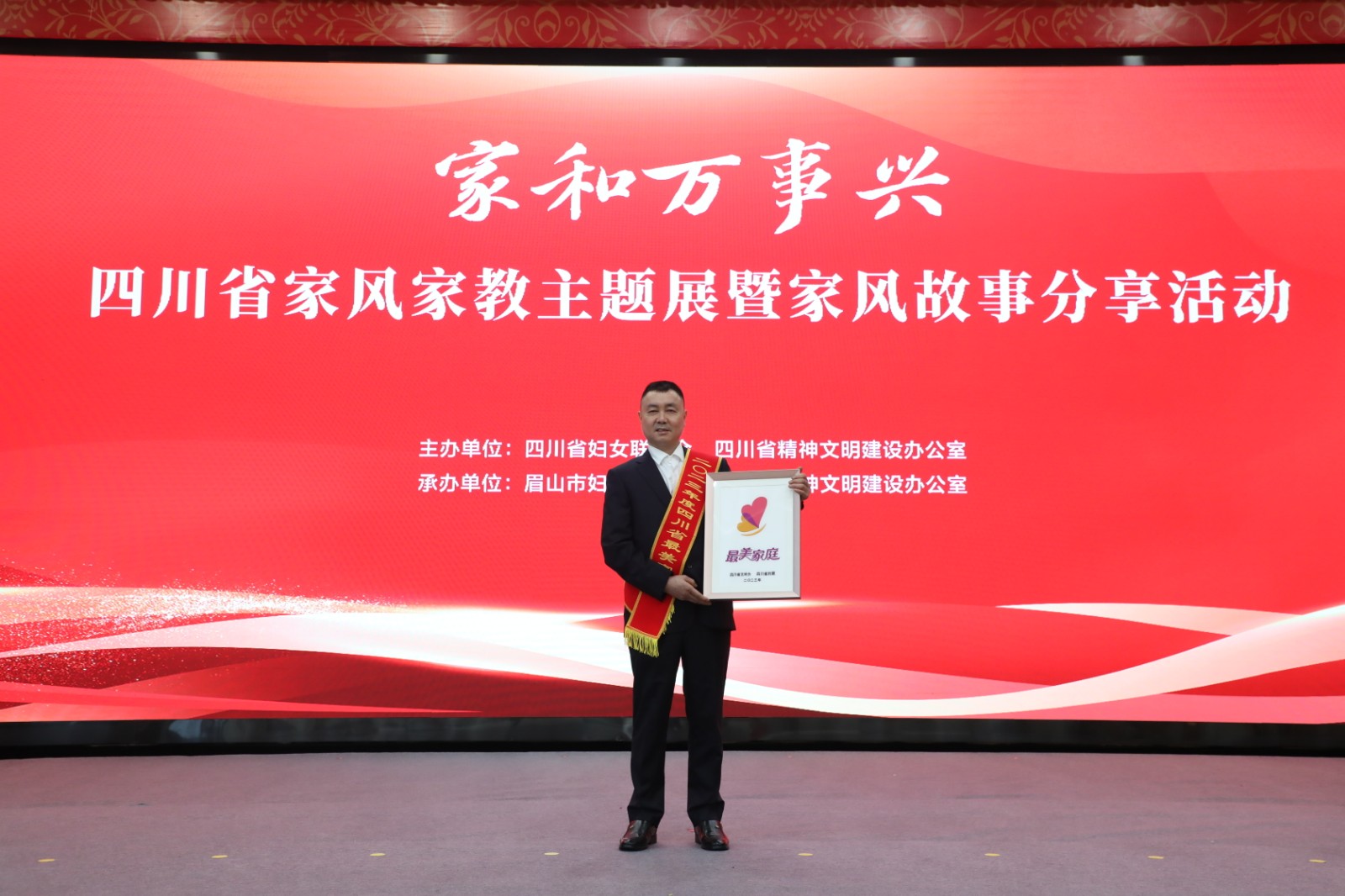 四川省劳动模范、星空(中国)职工杨孝金家庭荣获2023年四川省“最美家庭”荣誉。5月11日,杨孝金作为省国资系统“最美家庭”代表参加了省妇联、省文明办在眉山市举办的“家和万事兴——家风家教主题展”暨家风故事分享活动。