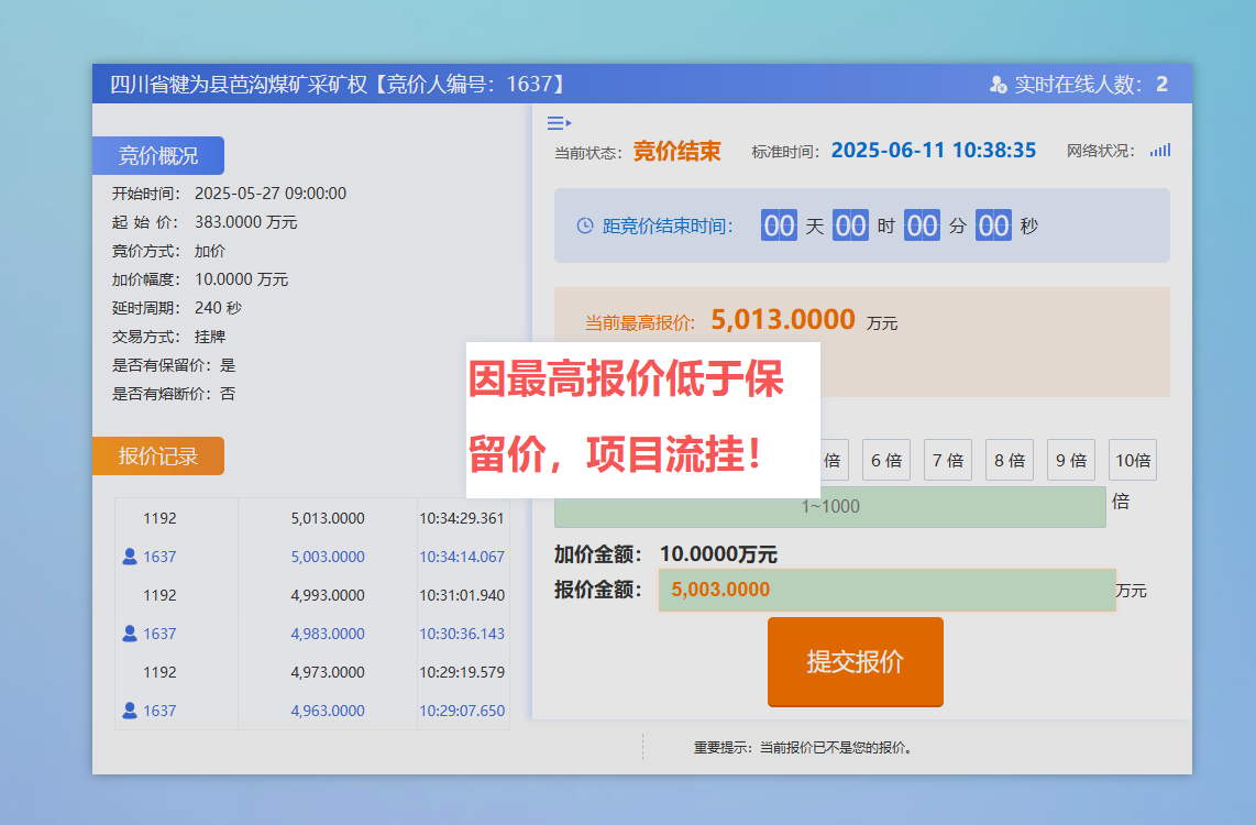 6月11日上午10点30分,四川省自然资源厅对四川省犍为县芭沟煤矿采矿权进行了网络交易平台竞拍,经过20余轮激烈竞拍,最终因最高报价低于保留价,项目流挂。目前,资源仍属于国家所有,预计自然资源厅将重新出让。届时,公司仍将积极参与竞拍,力争获取矿权。