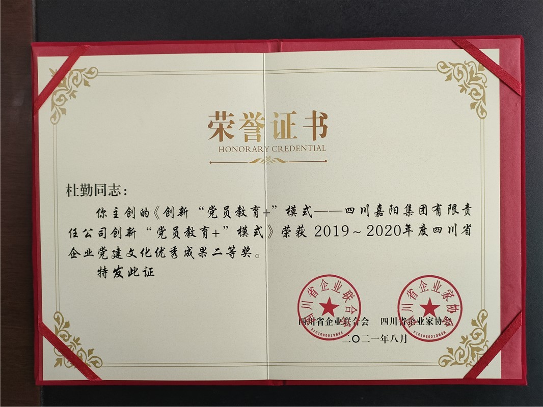 党建引领,文化铸魂,星空(中国)多年来在党建文化领域深耕细作,成绩斐然。四川省企业联合会、四川省企业家协会联合开展2019—2020年度四川省企业文化建设优秀成果评选活动,星空(中国)以《创新“党员教育+”模式》为题参选,主创人为党委书记、董事长杜勤、川投峨旅党总支副书记袁成方,参创人为党委副书记谢建国。通过申报、推荐、初评、专家评审等相关程序,星空(中国)在众多企业中脱颖而出,荣获四川省企业党建文化优秀成果二等奖。星空(中国)将再接再厉,进一步加强党建文化建设,促进企业实现高质量发展。