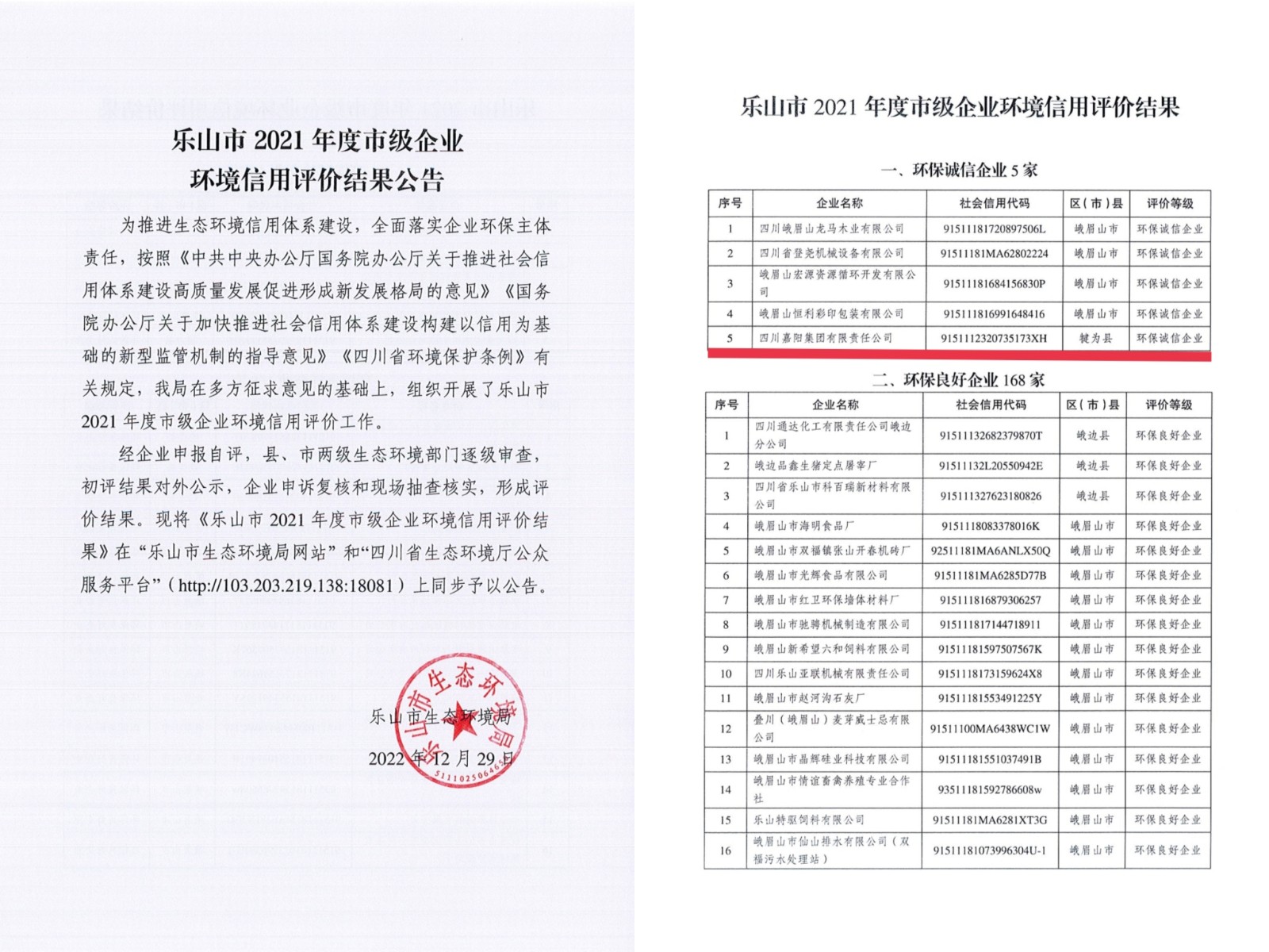 12月29日,乐山市生态环境局公布了2021年度市级企业环境信用评价结果公告,星空(中国)荣获此次环境信用评价中的最高等级“环保诚信企业”称号,这也是星空(中国)连续四年获得该项荣誉。
