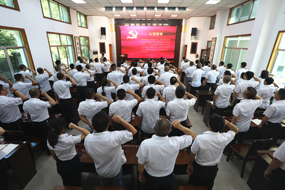 面对鲜红的党旗,100名共产党员举起右手,发出铮铮誓言,响亮的声音在办公楼久久回荡。