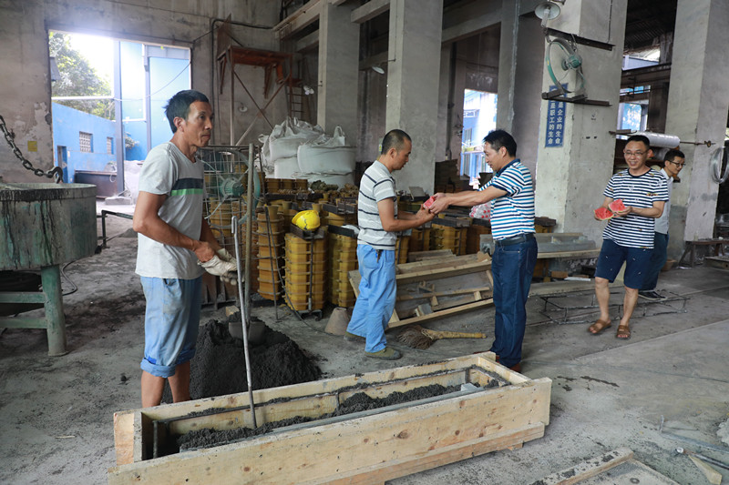 在副总经理王维洪、袁成金的带领下,机关二支部的党员代表们带着西瓜、矿泉水等防暑降温物品来到机电制造维修分公司,走进装配车间、精工车间、铸造车间、预制车间,看望慰问奋战在高温环境下的一线职工,为他们送去清凉与关怀。在装配车间,副总经理王维洪为正在辛苦工作的工人师傅们送上矿泉水,叮嘱他们天气越热越要多喝水,同时提醒大家要合理调整作息时间,注意劳逸结合,确保安全度夏。来到精工车间,副总经理袁成金向忙碌的工人师傅们一边道着辛苦一边递上西瓜,“歇一歇,吃块西瓜凉快一下!”关怀的话语沁人心脾,清凉传递到了四个车间里的每个职工身上。两位领导要求机电分公司主管领导一定要做好防暑降温工作,在确保职工们安全、健康的前提下组织生产。